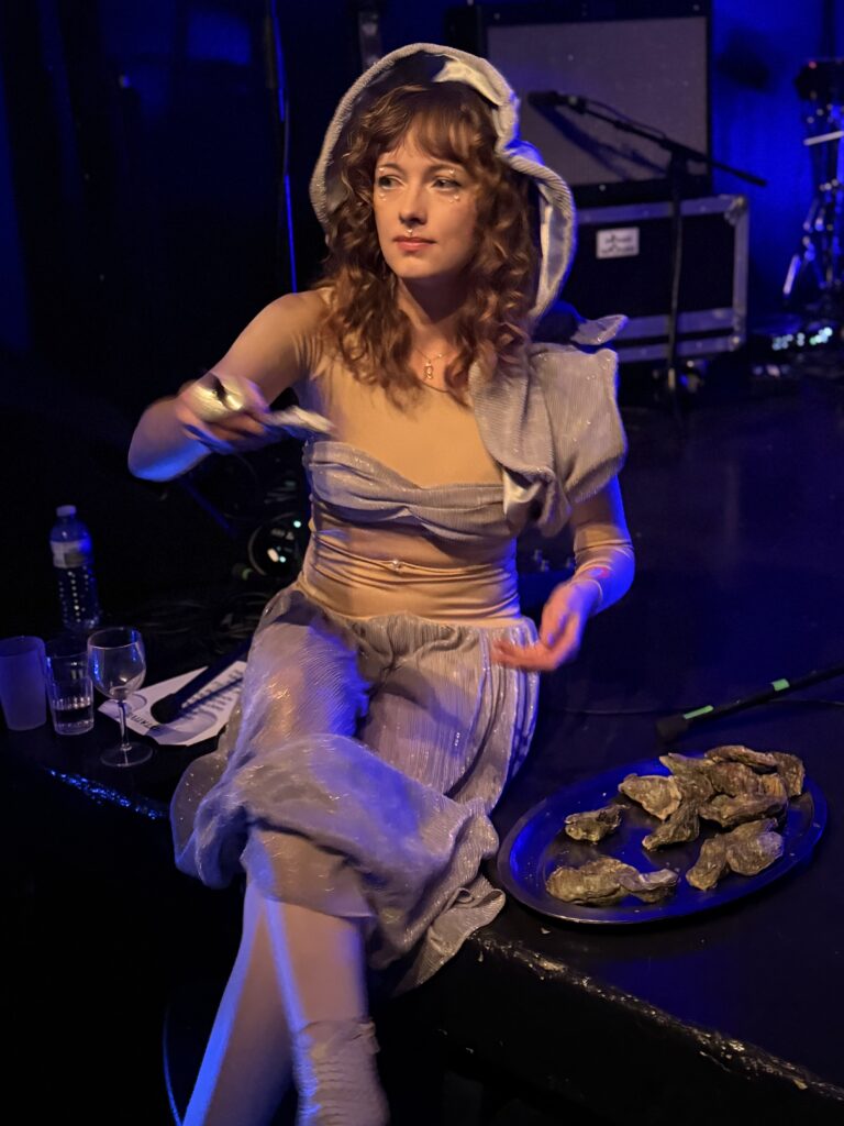 Une croix verte LED géante s’allume – néon iconique des officines de quartier –, signal clair que la pharmacopée commence. Une femme entre, plateau de fruits de mer en main, et ouvre des huîtres avec une précision chirurgicale, les distribuant comme des cachets dans une salle d’attente surpeuplée. Pendant ce temps, le thème instrumental LA FILLE PHARMACIE flotte dans l’air enfumé : entrée en matière délicate comme une incision au scalpel, annonçant un show où burlesque et malaise se prescrivent mutuellement.