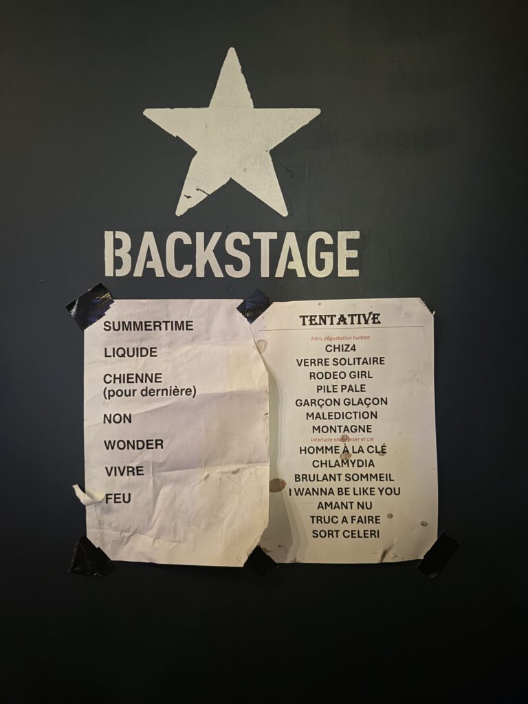 Titi s’adresse naturellement au public : « Bonsoir ! Ce soir, c’est le lancement du label Rideau Records et la release party de l’album de Tentative… Allez, on vous fait un classique : CHIENNE (POUR DERNIÈRE) ». Veste et lunettes tombent, il dédie le titre suivant, NON, à sa filleule – avec la menace amusante de le lui répéter en boucle si elle n’écoute pas. Les lumières passent en flashs stroboscopiques blancs : l’intensité monte.