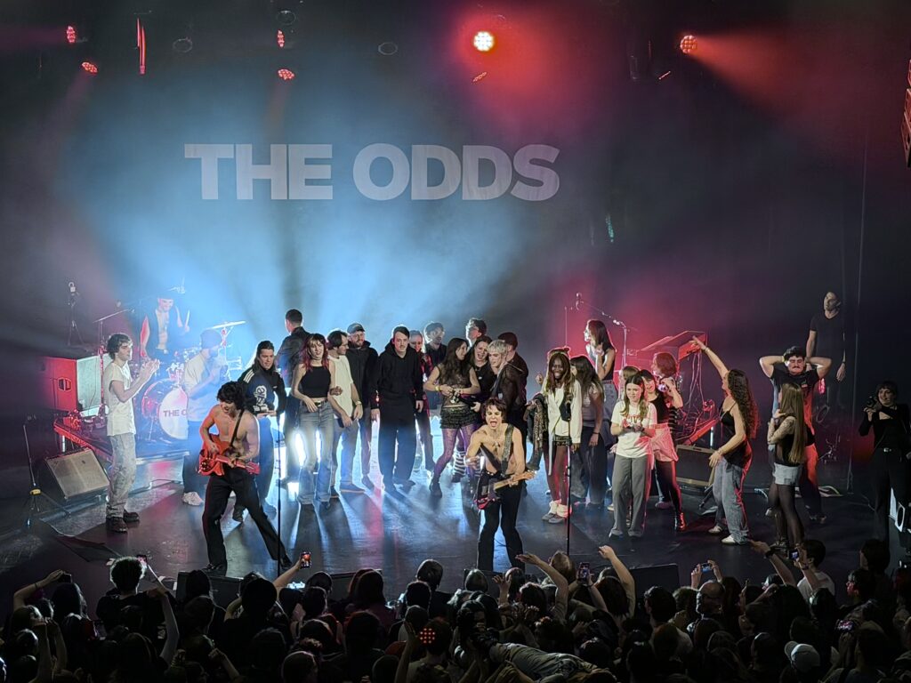 Vient alors le seul souffle acoustique de la soirée : ENFANT DE LUCIFER. Les quatre s’assoient au bord de la scène, Alexis à la guitare acoustique. Une constellation de téléphones s’allume dans la salle, comme mille petites flammes qui répondent à la voix fragile et belle du morceau. Un silence religieux, puis des chœurs spontanés. Poésie pure. César déclare alors : « On s’appelle The Odds et c’est un putain d’honneur d’être ici avec vous ce soir ! ». Les mots tombent comme une confession alors que le groupe se repositionne pour continuer à déployer le deuxième EP avec AVANT QU’ELLE NE PARTE, puis SANS AVENIR dont le final est repris avec une énergie saisissante.