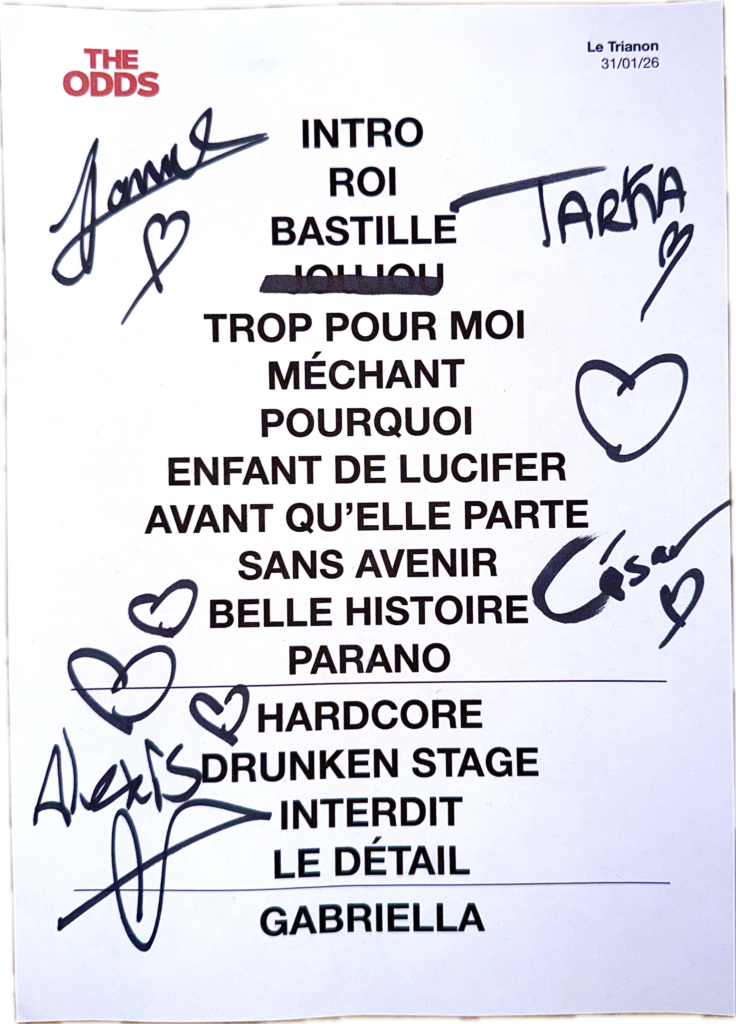 Hier soir, le 31 janvier, The Odds a transformé la salle mythique du Trianon en un véritable volcan rock. Devant une foule compacte et survoltée, le quatuor parisien – Tarka Decamps (guitare/chant), César Calles (guitare/chant), Alexis Vialatel (basse) et Julien Samuel (batterie) – a livré une performance généreuse, intense et parfaitement maîtrisée, confirmant son statut de révélation montante du rock hexagonal.